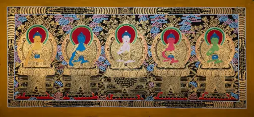 Five Dhyani Buddha Thangka (Lateral Nagthang Black-Gold Style)