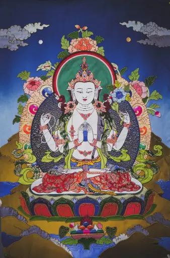 4-Armed Chenrezig Thangka – Tibetan Silk Applique