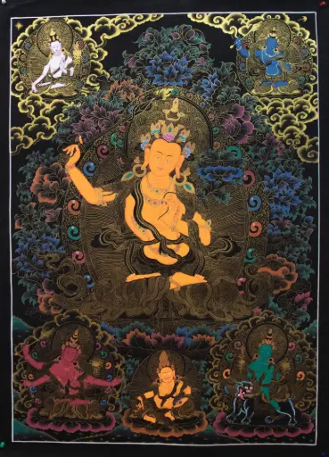 Golden Manjushri Thangka – Five Dhyani Buddhas with Chenrezig and Vajrapani