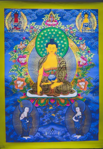 Shakyamuni Buddha Thangka –Masterpiece with Five Dhyani Buddhas – The Golden Radiance of Dharma